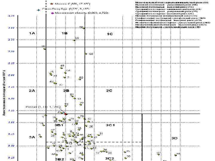 Распределение регионов по рейтингу климата Максимальный потенциал — минимальный риск (1 A) Средний потенциал — минимальный риск (2 A) ‐ Ростовская область Пониженный потенциал — минимальный риск (3 A 1) Липецкая область, Воронежская область Незначительный потенциал — минимальный риск (3 A 2) Высокий потенциал — умеренный риск (1 B) Московская область, Москва, Санкт‐Петербург, Свердловская область Средний потенциал — умеренный риск (2 B) Республика Башкортостан, Республика Татарстан, Пермский край, Нижегородская область Пониженный потенциал — умеренный риск (3 B 1) Удмуртская Республика Незначительный потенциал — умеренный риск (3 B 2) ‐ Марий Эл, Мордовия Максимальный потенциал — высокий риск (1 C) Средний потенциал — высокий риск (2 C) - Иркутская область Пониженный потенциал — высокий риск (3 C 1) Незначительный потенциал — высокий риск (3 C 2) Низкий потенциал — экстремальный риск (3 D)