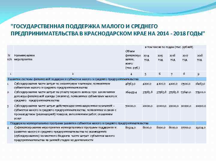 "ГОСУДАРСТВЕННАЯ ПОДДЕРЖКА МАЛОГО И СРЕДНЕГО ПРЕДПРИНИМАТЕЛЬСТВА В КРАСНОДАРСКОМ КРАЕ НА 2014 - 2018 ГОДЫ" N п/п 1 Наименование мероприятия Объем финансиро вания, всего (тыс. руб. ) 2 в том числе по годам (тыс. рублей) 2014 2015 2016 2017 2018 год год год 4 5 Развитие системы финансовой поддержки субъектов малого и среднего предпринимательства 1 Субсидирование части затрат по лизинговым платежам, понесенным 48563, 0 4200, 0 субъектами малого и среднего предпринимательства 2 Субсидирование части затрат на уплату первого взноса при заключении 264439, 4 37565, 8 договора финансовой аренды (лизинга), понесенных субъектами малого и среднего предпринимательства 6 7 8 9 4200, 0 17500, 0 18463, 0 37565, 8 73840, 0 77902, 0 10000, 0 20000, 0 Поддержка муниципальных программ развития субъектов малого и среднего предпринимательства 4 Софинансирование мероприятия муниципальных программ поддержки и 80924, 0 8000, 0 27700, 0 развития малого и среднего предпринимательства по возмещению (субсидированию) из местного бюджета части затрат субъектов малого предпринимательства на ранней стадии их деятельности 29224, 0 3 Субсидирование части затрат действующих инновационных компаний – субъектов малого и среднего предпринимательства, понесенных в связи с производством (реализацией) товаров, выполнением работ, оказанием услуг 70000, 0 10000, 0
