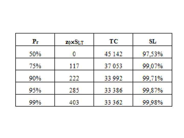 Пример • Дано: D = 11000 – средний объем годового спроса, шт/год; SD = 300 – СКО годового спроса, шт/год; LT = 4 дн; C = 53 – стоимость единицы товара, руб/шт; S = 320 – затраты на доставку/производство партии товара (их постоянная часть, не зависящая от размера партии), руб; I = 10 – годовая норма прибыли (или ставка банковского процента), %/год; k = 2, 50 – удельные издержки непокрытия, руб/шт; Pr = 75% – вероятность покрытия спроса за период (Т+LT). • Требуется рассчитать параметры модели периода заказа: T; M; AIL; N; TC; SL.