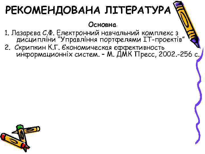 РЕКОМЕНДОВАНА ЛІТЕРАТУРА Основна: 1. Лазарєва С. Ф. Електронний навчальний комплекс з дисципліни “Управління портфелями ІТ-проектів” 2. Скрипкин К. Г. Єкономическая єффективность информационніх систем. – М. ДМК Пресс, 2002. -256 с.