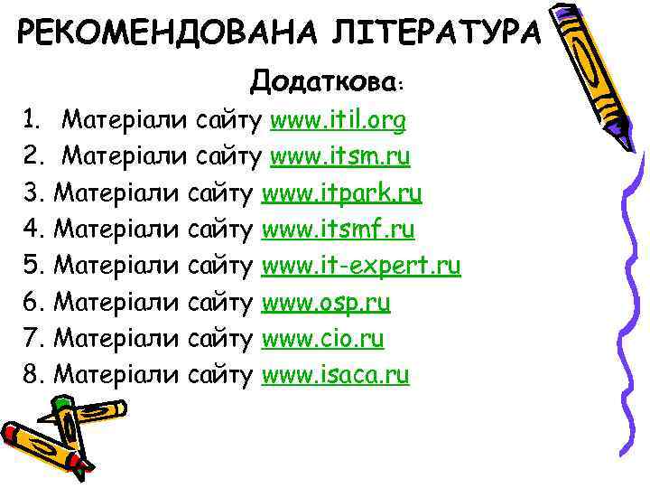 РЕКОМЕНДОВАНА ЛІТЕРАТУРА Додаткова: 1. Матеріали сайту www. itil. org 2. Матеріали сайту www. itsm. ru 3. Матеріали сайту www. itpark. ru 4. Матеріали сайту www. itsmf. ru 5. Матеріали сайту www. it-expert. ru 6. Матеріали сайту www. osp. ru 7. Матеріали сайту www. cio. ru 8. Матеріали сайту www. isaca. ru