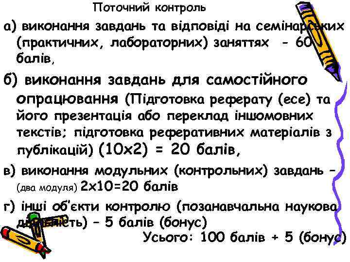 Поточний контроль а) виконання завдань та відповіді на семінарських (практичних, лабораторних) заняттях - 60 балів, б) виконання завдань для самостійного опрацювання (Підготовка реферату (есе) та його презентація або переклад іншомовних текстів; підготовка реферативних матеріалів з публікацій) (10 х2) = 20 балів, в) виконання модульних (контрольних) завдань – (два модуля) 2 х10=20 балів г) інші об’єкти контролю (позанавчальна наукова діяльність) – 5 балів (бонус) Усього: 100 балів + 5 (бонус)
