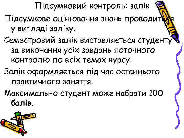 Підсумковий контроль: залік Підсумкове оцінювання знань проводиться у вигляді заліку. Семестровий залік виставляється студенту за виконання усіх завдань поточного контролю по всіх темах курсу. Залік оформляється під час останнього практичного заняття. Максимально студент може набрати 100 балів.