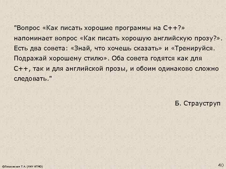 "Вопрос «Как писать хорошие программы на С++? » напоминает вопрос «Как писать хорошую английскую прозу? » . Есть два совета: «Знай, что хочешь сказать» и «Тренируйся. Подражай хорошему стилю» . Оба совета годятся как для С++, так и для английской прозы, и обоим одинаково сложно следовать. " Б. Страуструп ©Павловская Т. А. (НИУ ИТМО) 40