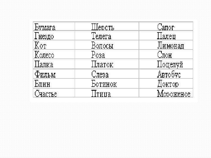 Упражнение № 4 Цель этого упражнения - заставить детей поразмышлять о словах. Ведущий говорит: "Сейчас я буду читать (показывать) (в зависимости от тренируемого типа памяти) слова, услышав (увидев) каждое слово, представляйте себе внешний вид данного предмета, его вкус, запах, звуки, которые он может издавать, и т. п.