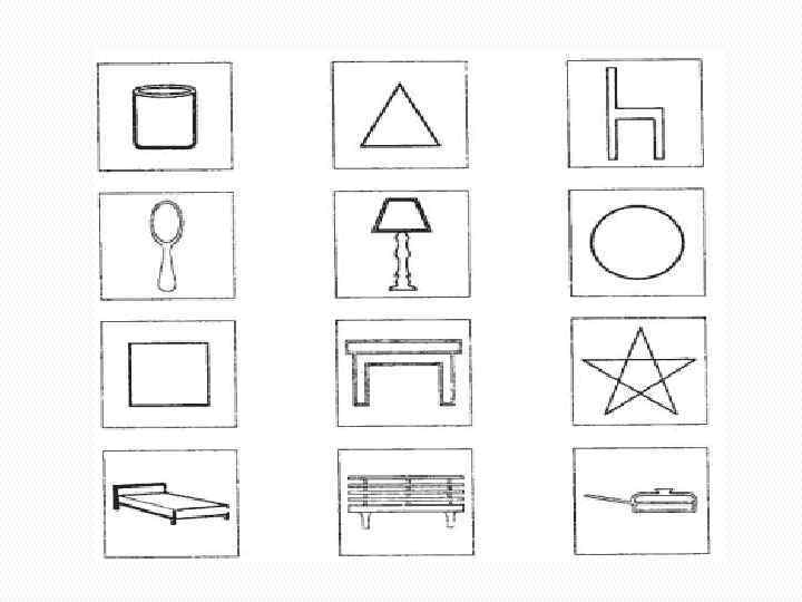 Упражнение № 2 Для этого упражнения потребуются листок бумаги, карандаши и секундомер. На рисунке, приведенном ниже, представлены 12 изображений. Детям предлагается рассмотреть рисунки первой строки, закрыв остальные листом бумаги, чтобы они не отвлекали внимание. Спустя 30 сек попросите их закрыть целиком всю страницу и нарисовать по памяти предметы первой строки. Затем предложите им сравнить, насколько их рисунки соответствуют рисункам образца. Далее перейдите к следующей строке. С двумя последними строками поработайте одновременно.