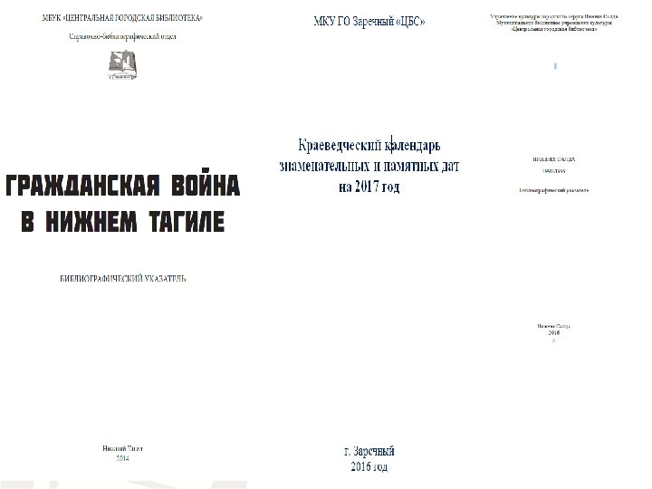 Тематика пособий Красноуральск. Рядом с настоящим прошлое Это 2 -й выпуск, посвященный городу. Из предисловия: «…Во второй выпуск пособия включены источники с 2008 по 2015 годы, всего в количестве 1902. Публикации с 1981 по 2007 годы Вы найдёте в первой части одноимённого указателя, выпущенного в 2007 году. Настоящее издание является продолжением, добавлена новая рубрика «Красноуральск в сети Интернет» … Проект «Краеведческий календарь городского округа Заречный» рассчитан на 5 лет. Первый выпуск Краеведческого календаря вышел в 2013 году.