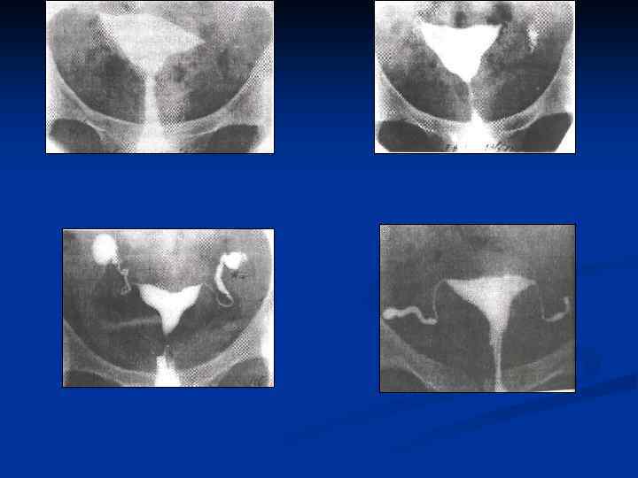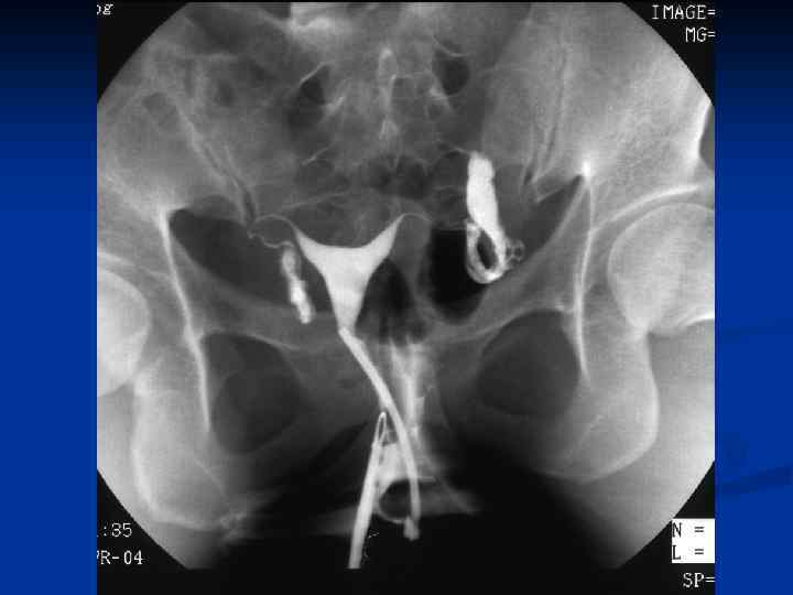 n n n Провести рентгеновское исследование грудной клетки, а если есть показания, то и других органов; Определить туберкулиновую чувствительность; Назначить и провести гистеросальпингографию с 60% раствором водорастворимого верографина, при этом возможно: n n n Определить состояние маточных труб (тонкие, ригидные, запаянные ампулярные отделы, деформация в виде четок, курительных трубок); Выявить форму полости матки, ее размеры, наличие или отсутствие сокращений; Диагностировать наличие / отсутствие рефлюкса контрастного вещества из труб.