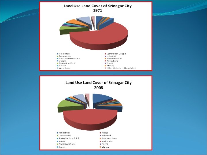 Land use 1. Residential 2. Semi-urban Village 3. Commercial 4. Industrial 5. Parks/Gardens & P. G 6. Restricted Area 7. Vacant 8. Agriculture 9. Plantation/Orchard 10. Forest 11. Barren 12. Marshy 13. Water body 14. Others (Edu, Govt, Hosp, Relig) TOTAL Total Built Up Total Non Built Up Total Urban Area 1971 2008 Change % age Change 1074. 5 (4. 58%) 146 (0. 62%) 143. 5 (0. 61%) 90. 5 (0. 39%) 140 (0. 59%) 446 (1. 9%) 517 (2. 2%) 14408 (61. 45%) 1266. 5 (5. 40%) 346. 5 (1. 47%) 539. 5 (2. 3%) 1667 (7. 1%) 2145. 5 (9. 15%) 516 (2. 2%) 3851 (16. 42%) 399 (1. 7%) 268. 5 (1. 14%) 226. 5 (0. 97%) 372 (1. 59%) 715 (3. 04%) 255 (1. 08%) 10949 (46. 7%) 2622 (11. 18%) 153. 5 (0. 65%) 480 (2. 05%) 468. 5 (2%) 1895 (8. 08%) 791. 5 (3. 37%) 2776. 5 258. 3 253 173. 2 125 87. 1 136 150. 2 232 165. 7 269 60. 3 -262 -50. 6 -3459 -24 1395. 5 110. 1 -193 -55 -59. 5 -1198. 5 -71. 8 -250. 5 -11. 6 275 53 23446. 5 2556. 5 20890 2410. 5 23446. 5 6623. 5 16823 6224. 5 --4067 3814 --159 -19. 46 158. 2 Table Showing Land use Land Cover of Srinagar city