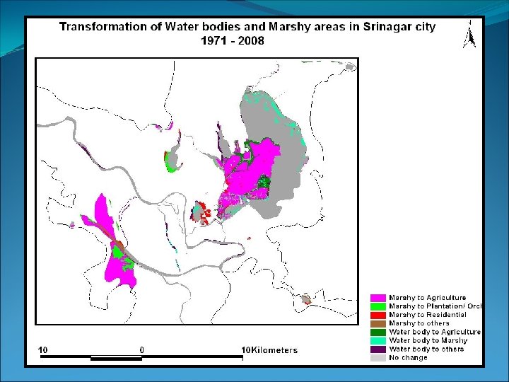 Contd… Marshy to Plantation/Orchards: 1. Southern Khuhalsar (33. 5 hectares) 2. In Rakh-i-Gandakshah (34 hectares) 3. Lokut Dal (24. 5 hectares) 4. Brari nambal (16 hectares) 108 hectares Urban forestry Marshy to others: 1. Rakh-i- Gandakshah (29 hectares) 2. Some patches in the west of Dal lake at Hazratbal (20 hectares) 49 hectares Conversion into built-up land Significant area under marsh got shrink. Extinction of this marsh
