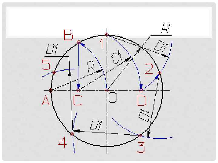 ДЕЛЕНИЕ ОКРУЖНОСТИ НА 5 ТЬ РАВНЫХ ЧАСТЕЙ • http: //graph. power. nstu. ru/ata/gp/geom/001/geometr_ 02/03/03. html • Деление окружности на пять равных частей выполняется в следующей последовательности: • Из точки А радиусом, равным радиусу окружности R, проводим дугу, которая пересечет окружность в точке В; • Из точки В опускают перпендикуляр на горизонтальную осевую линию; • Из основания перпендикуляра - точки С, радиусом равным С 1, проводят дугу окружности, которая пересечет горизонтальную осевую линию в точке D; • Из точки 1 радиусом равным D 1, проводят дугу до пересечения с окружностью в точке 2, дуга 12 равна 1/5 длины окружности; • Точки 3, 4 и 5 находят откладывая циркулем по данной окружности хорды, равные D 1.