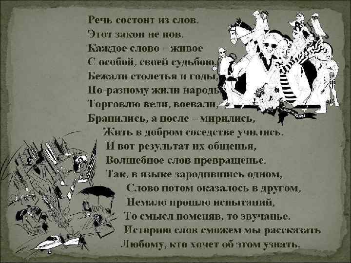 Издалёка завезённых Через горы и моря Много слов иноплемённых Есть под властью словаря. И при этом все слова Под его смогли началом Обрести в строю бывалом Равнозначные права.