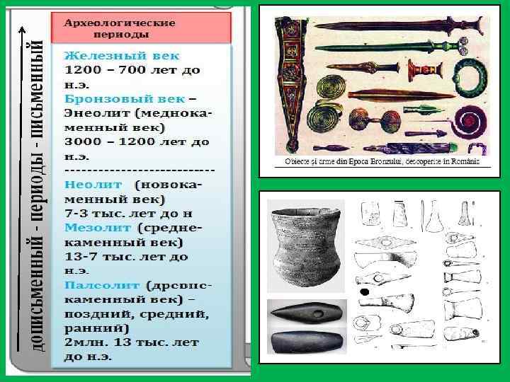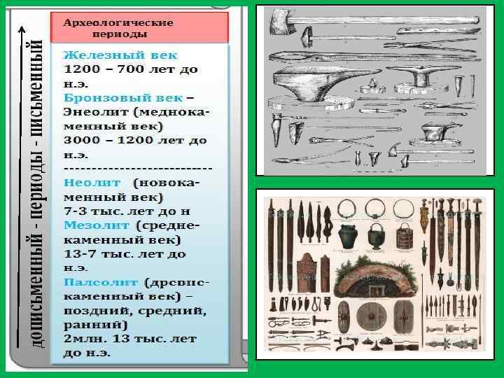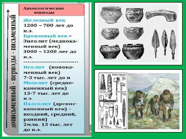 Как полагают учёные-историки древнейший человек появился на Земле около 2 млн. лет тому назад. Самый длительный период существования человека на Земле, от его появления до V века нашей эры историки назвали историей Древнего мира. Для того чтобы было проще изучать этот громадный промежуток времени, учёные условно разделили этот промежуток времени на археологические периоды в зависимости от того из какого материала изготавливались основные орудия труда. Таким образом, учёныеисторики выделили следующие исторические эпохи: палеолит (древнекаменный век) (примерно 2 млн. -13 тыс. лет до н. э. ), который разделили в свою очередь на три периода – ранний, средний и поздний; мезо-лит (среднекаменный век) (примерно 13 - 7 тысяч лет до н. э. ); неолит (новокаменный век) (примерно 7 – 3 тыс. лет до н. э. ). Все эти три эпохи относятся к дописьменному периоду истории человечества. К письменному периоду истории человечества относятся следующие эпохи: энеолит (меднокаменный век) (примерно 3000 – 1200 лет до н. э. ); бронзовый век и железный век (примерно 1200 – 700 лет до н. э. ).