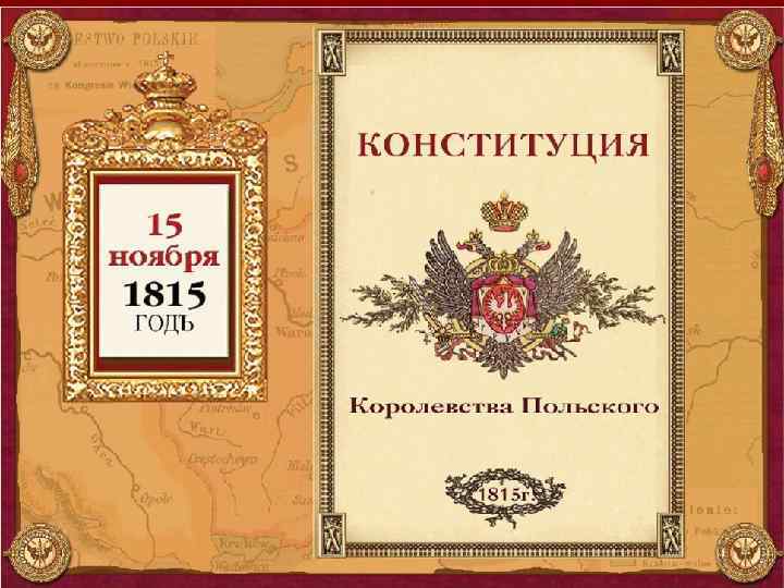 - Конституция превращала только что созданное государство в наследственную монархию, «навсегда соединенную с Российской империей» . Король назначал наместника, каковым мог быть лишь поляк; исключение делалось для наместника из членов Императорского Дома. - Особой статьей обеспечивалась свобода печати. - Обеспечивалась свобода личности. - Польский язык объявлялся языком администрации, суда, войска и т. п. ; все должности должны были замещаться только одними поляками.