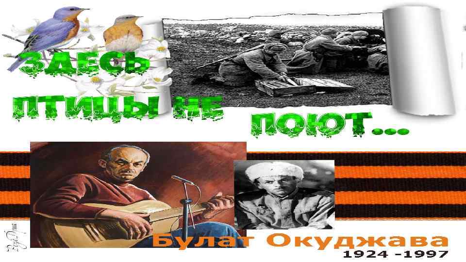 12 слайд Урок-концерт Стихи и песни о Великой Отечественной войне. Боевые подвиги и военные будни в творчестве М. Исаковского ( «Катюша» , «Враги сожгли родную хату…» ), Б. Окуджавы ( «Песенка о пехоте» , «Здесь птицы не поют…» ), А. Фатьянова ( «Соловьи» ), Л. Ошанина ( «Дороги» ).