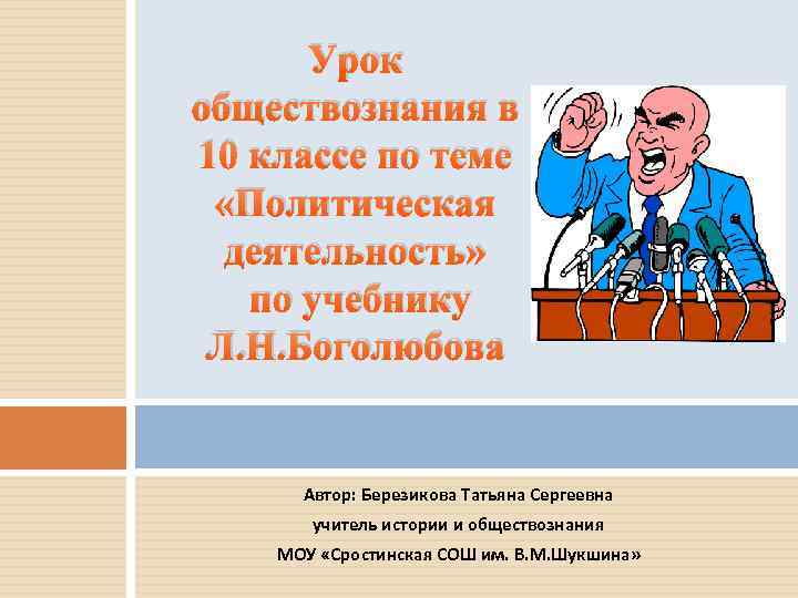 Урок обществознания в 10 классе по теме «Политическая деятельность» по учебнику Л. Н. Боголюбова Автор: Березикова Татьяна Сергеевна учитель истории и обществознания МОУ «Сростинская СОШ им. В. М. Шукшина»