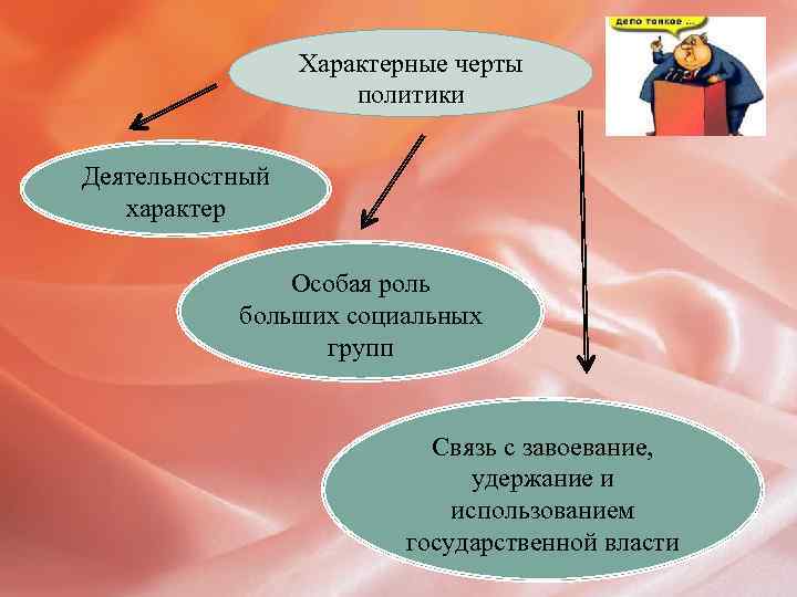 Характерные черты политики Деятельностный характер Особая роль больших социальных групп Связь с завоевание, удержание и использованием государственной власти
