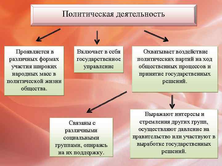 Политическая деятельность Проявляется в различных формах участия широких народных масс в политической жизни общества. Включает в себя государственное управление Связаны с различными социальными группами, опираясь на их поддержку. Охватывает воздействие политических партий на ход общественных процессов и принятие государственных решений. Выражают интересы и стремления других групп, осуществляют давление на правительство или участвуют в выработке государственных решений.