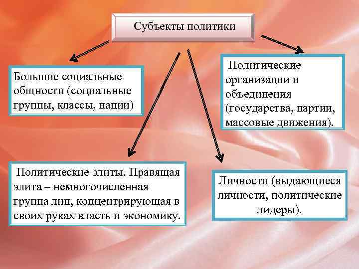 Субъекты политики Большие социальные общности (социальные группы, классы, нации) Политические элиты. Правящая элита – немногочисленная группа лиц, концентрирующая в своих руках власть и экономику. Политические организации и объединения (государства, партии, массовые движения). Личности (выдающиеся личности, политические лидеры).