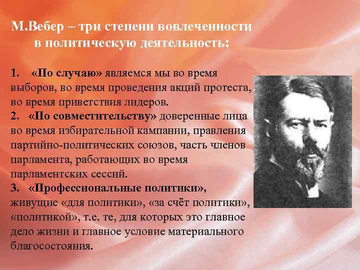 М. Вебер – три степени вовлеченности в политическую деятельность: 1. «По случаю» являемся мы во время выборов, во время проведения акций протеста, во время приветствия лидеров. 2. «По совместительству» доверенные лица во время избирательной кампании, правления партийно-политических союзов, часть членов парламента, работающих во время парламентских сессий. 3. «Профессиональные политики» , живущие «для политики» , «за счёт политики» , «политикой» , т. е. те, для которых это главное дело жизни и главное условие материального благосостояния.