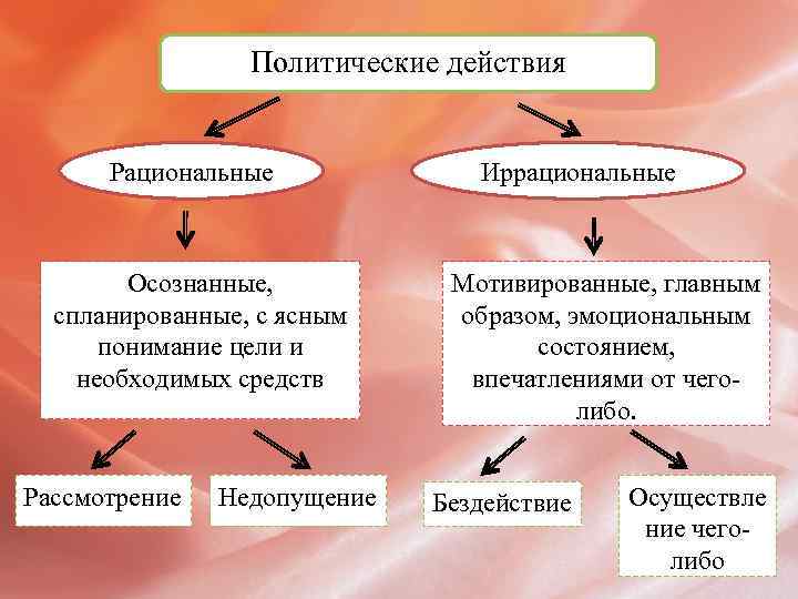 Политические действия Рациональные Осознанные, спланированные, с ясным понимание цели и необходимых средств Рассмотрение Недопущение Иррациональные Мотивированные, главным образом, эмоциональным состоянием, впечатлениями от чеголибо. Бездействие Осуществле ние чеголибо