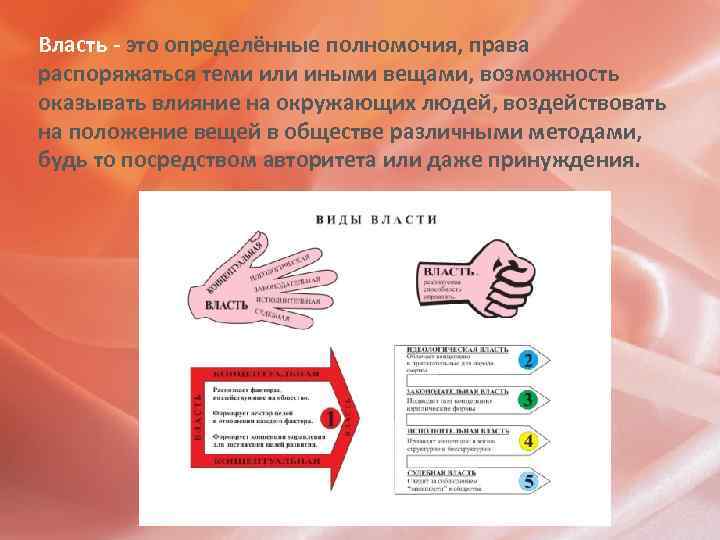 Власть - это определённые полномочия, права распоряжаться теми или иными вещами, возможность оказывать влияние на окружающих людей, воздействовать на положение вещей в обществе различными методами, будь то посредством авторитета или даже принуждения.