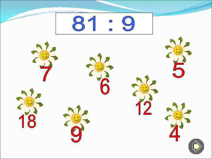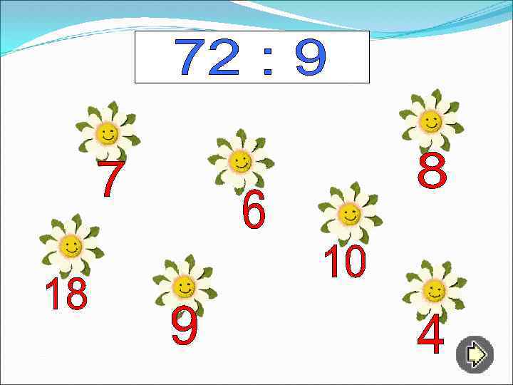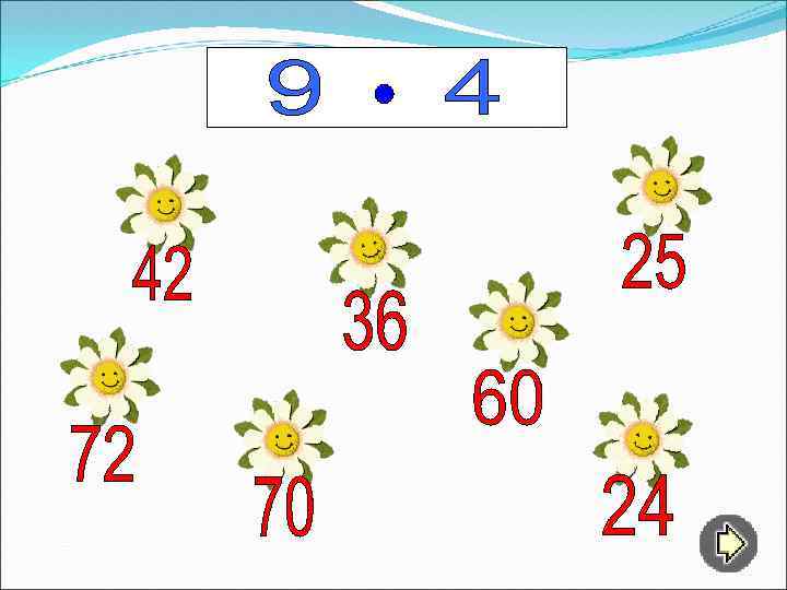 Игру можно применить как закрепление или повторение табличных случаев умножения и деления. Таблица на слайде 3 – содержание. Ученик может выбрать номер любой «страницы» , а после выполнения задания вернуться к содержанию нажатием стрелки в нижнем левом углу слайда. Навести мышку на ромашку с выбранным ответом. Ромашка с неверным ответом растворится. Ромашка с правильным ответом – заговорит.