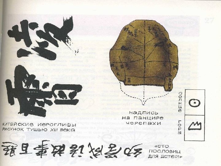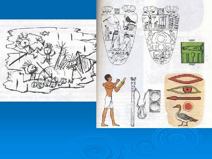 Первыми элементами письменности были простые рисунки или зарубки на палочках. Ø Первые письмена были похожи на загадки-ребусы. Ø Рисунки изображали конкретные предметы — например, дерево или дом, человека или животное.