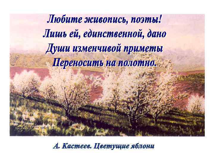 II группа Задание: составьте и запишите текст по данному началу. Художник смотрит на землю с высоты, под ним расстилаются пастбища. На переднем плане. . . А. Кастеев Цветущие яблони (1958)