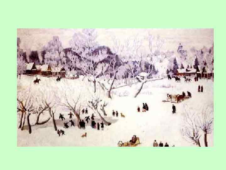Что вы видите на картине? Мы видим окраину деревни, речку, по берегам деревья, причудливо разукрашенные, принаряженные снегом, мальчишки на коньках, собаки бегают…