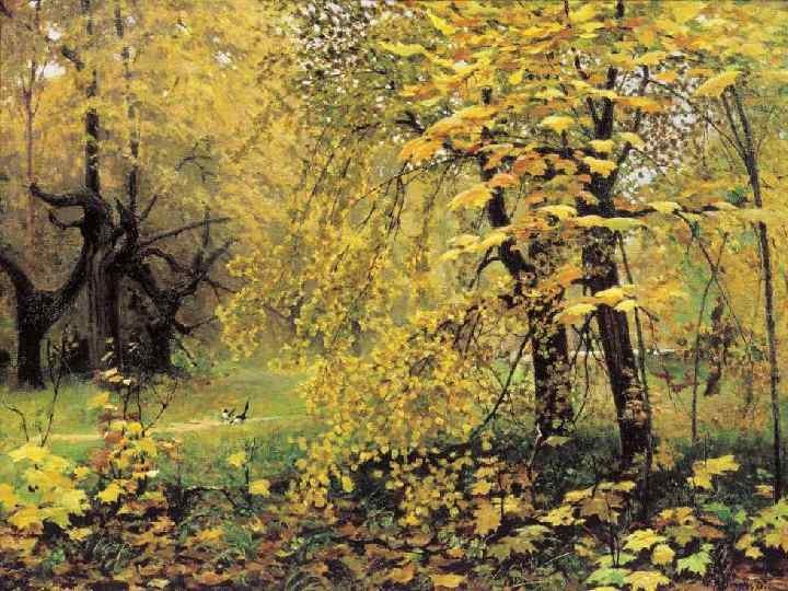 Что изображено на картине? Осень. Лес. Старые клёны. Молодые клены. Листья на земле. Тропинка. Сороки. Сплетенные деревья. Небо. Рабочие материалы Яркая, огненная, пламенная, золотая, волшебная, праздничная Сказочный, необычный, похож на сказку, таинственный, загадочный, терем Огромные, роскошные, раскидистые, гибкие ветви, золотой водопад Тонкие, гибкие, как лианы, тянутся к солнцу Как ковер из крупных разноцветных листьев, неповторимый узор Ее обступили деревья, чуть заметно вьется, устлана опавшими листьями Среди моря осенней травы и листьев, белобокие вертихвостки с черной головой Напоминают чудовище, гигантского паука, покрыты светло желтыми листьями
