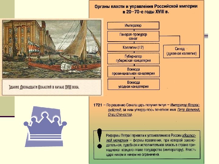 Реформы управления Царь, с 1721 г. - император Генерал-прокурор Президент, Вице-президент, советники Обер-прокурор присутствие сенат коллегии Генерал-фискалы Иностранных дел Военная Адмиралтейская Вотчинная Штатс-коллегия Коммерц-коллегия Юстиц-коллегия Камер-коллегия Мануфактур-коллегия Главный магистрат Ревизион-коллегия синод 1711 г. – создание Сената 1718 – 1722 г. – учреждение должности генерал-прокурора (П. И. Ягужинский) 1720 г. - создание Тайной канцелярии (П. А. Толстой) 1718 г. – создание коллегий 1721 г. – создание Синода