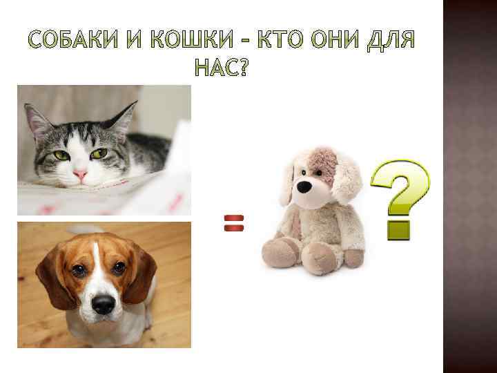 Команда «Собаки» Команда «Кошки» 1. Как человеку помогают кошки / собаки? 2. Сколько лет они живут? 3. Что нужно кошке / собаке каждый день? 4. Что ей может еще понадобиться? 5. А что нельзя делать с кошками и собаками? Почему?