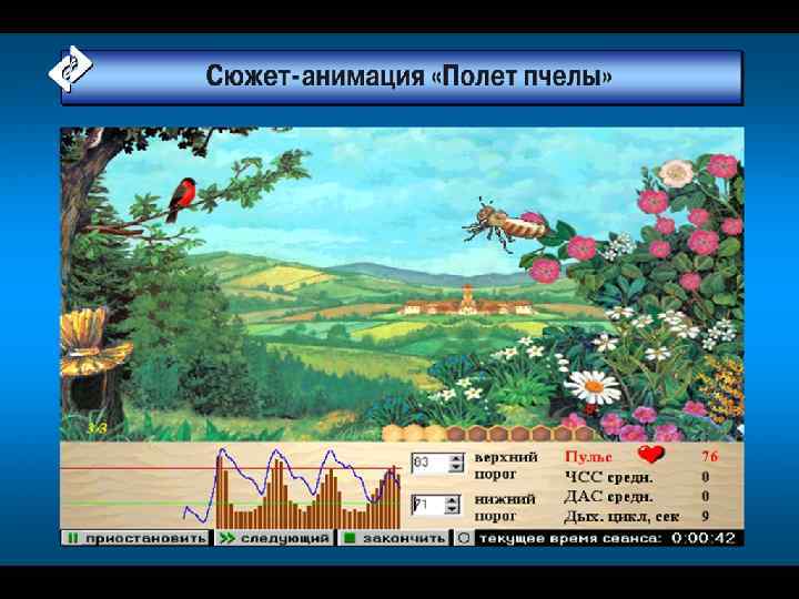 В течение сеанса демонстрируются различные сюжеты: стакан воды, который наполняется на вдохе и выливается на выдохе; красим бабочку, заборчик; протираем окно; пчела на вдохе летит за нектаром и на выдохе, возвращается обратно.