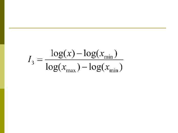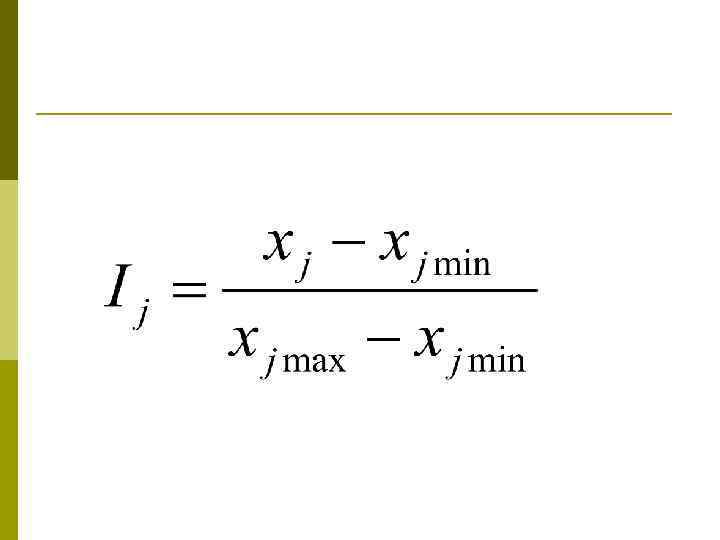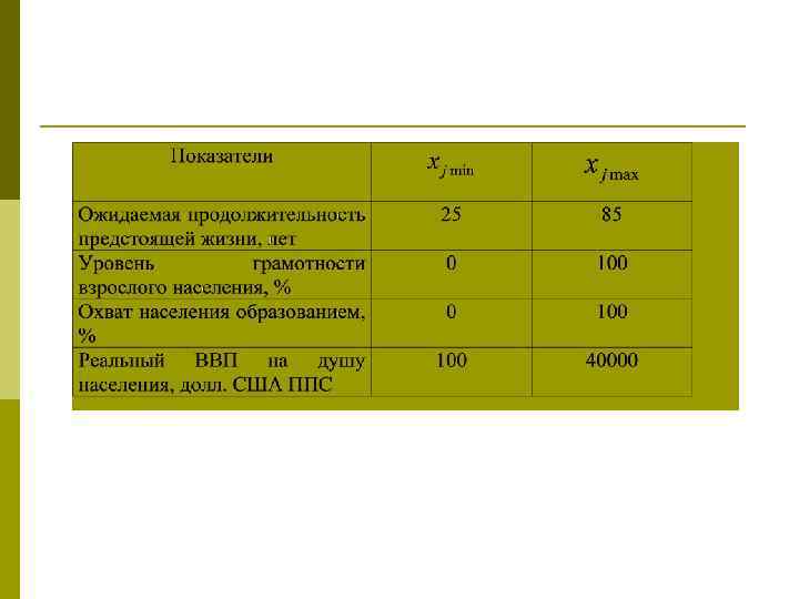 Расчет подиндексов для каждого изме p Для сферы образования уравнение 1 применяется к обоим субкомпонентам, в результате чего рассчитывается их среднее геометрическое, после чего уравнение 1 используется вторично p Для дохода используются натуральные логарифмы от минимального и максимального значений.