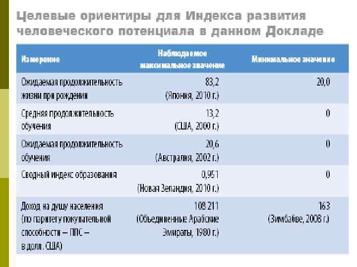 Показатели p p p Ожидаемая продолжительность жизни при рождении (Департамент ООН по экономическим и социальным вопросам). Средняя продолжительность обучения и ожидаемая продолжительность обучения (UNESCO - Institute for Statistics). Валовой национальный доход (ВНД) на душу населения (Всемирный банк и Международный валютный фонд).