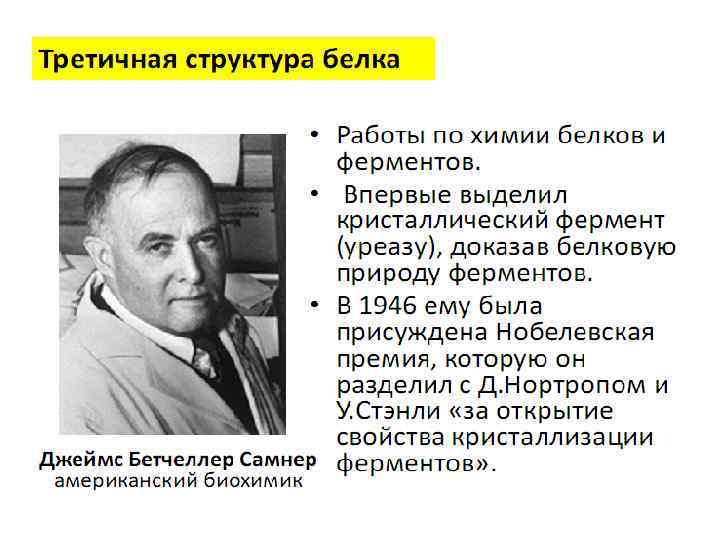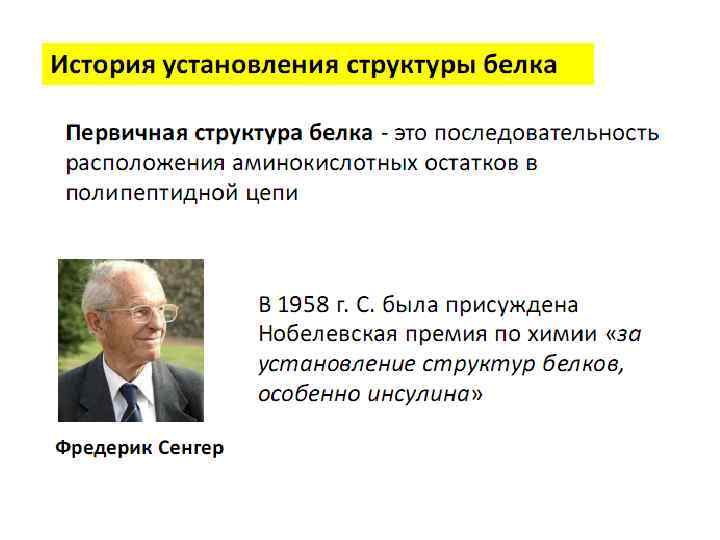 История изучения структуры белка • Лайнус Полинг считается первым учёным, который смог успешно предсказать вторичную структуру белков. • Позднее Уолтер Каузман внёс весомый вклад в понимание законов образования третичной структуры белков и роли в этом процессе гидрофобных взаимодействий. • В 1949 году Фред Сенгер определил аминокислотную последовательность инсулина, продемонстрировав таким способом, что белки — это линейные полимеры аминокислот, а не их разветвлённые (как у некоторых сахаров) цепи. • Первые структуры белков, основанные на дифракции рентгеновских лучей на уровне отдельных атомов были получены в 1960 -х годах и с помощью ЯМР в 1980 -х годах. • В 2006 году Банк данных о белках (Protein Data Bank) содержал около 40 000 структур белков.