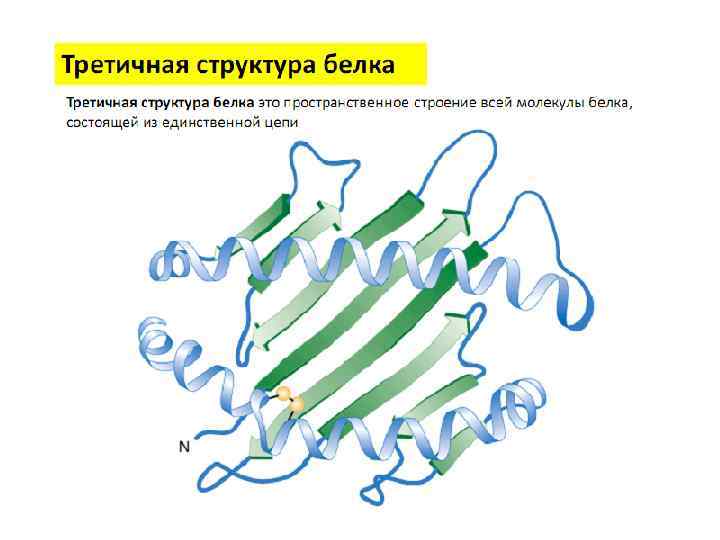 Третичная структура белка • В Α цепи имеются два коротких участка, а в В цепи — один длинный участок, построенные в виде α спирали. • При этом N конец А цепи и С конец В цепи располагаются в непосредственной близости друг от друга.