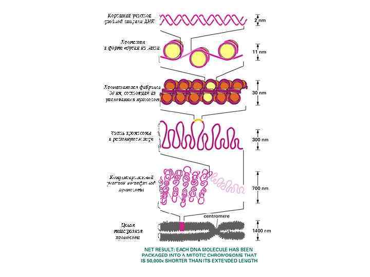Хромосомный уровень Вступление клетки из интерфазы в митоз сопровождается суперкомпактизацией хроматина. Отдельные хромосомы становятся хорошо различимы. Этот процесс начинается в профазе, достигая своего максимального выражения в метафазе митоза и анафазе. В телофазе митоза происходит декомпактизация вещества хромосом, которое приобретает структуру интерфазного хроматина. Митотическая суперкомпактизация облегчает распределение хромосом к полюсам митотического веретена в анафазе митоза. Толщина плеча хромосомы – 700 нм. Укорочение ДНП еще в 20 раз.