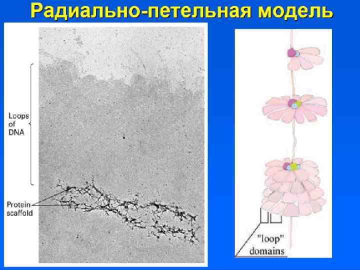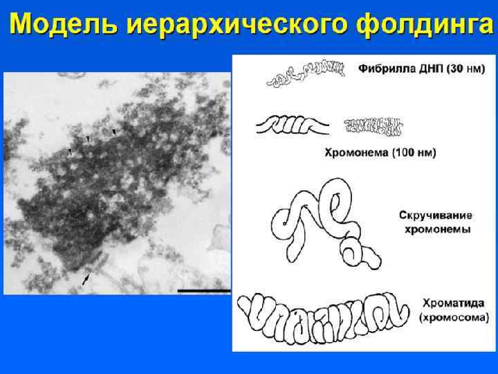 Супернуклеосомная нить образует петли и изгибы, составляя основу хроматиды. Обнаруживается в профазе. Диаметр петель = 50 нм, диаметр хроматиды 300 нм. Нить ДНП укорачивается еще в 10 -20 раз.