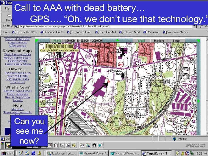 Two perspectives on using coordinates. . . In Rhode Island, cell phones equipped with GPS chip sets can be rapidly located to within 15 -m of true position. 9 -1 -1 organizations remain focused on conventional addresses, yet only about a fifth of the street addresses have been correlated to a coordinate. For incidents where the provided coordinate cannot be correlated to a street address there is no way to readily communicate a location to first responders who can only use street addresses to find places. As the Rhode Island 9 -1 -1 Director Ray La. Belle stated, "If I give an ambulance driver latitude and longitude coordinates, he's going to tell me where to go. " (Lagesse, 2003). “. . . In Iraq, Coalition Forces (particularly the U. S. Govt and U. S. Military) are using MGRS coordinates almost exclusively. They have GIS software and data that allows them to search for a particular address (building #, street # and house #) within the 9 districts of Baghdad and in a few other cities/regions of Iraq. The operators in the field will get intel about a person of interest being located at a particular address. We will use the GIS sw/data to locate that address on a map or imagery of the city. Then, using our data, we can provide an MGRS coordinate for that location. The operator can then plug that coordinate into his GPS and easily navigate to the building of interest in order to do surveillance. ” - US Government person, December 2005