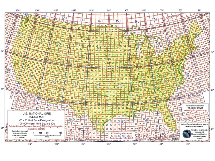 How to read the USNG… U UTM/USNG Grid Zone Designations 48°N 126° 120° 114° 108° 102° 96° 90° 84° 78° 72° 66° T 40°N S 18 S 32°N R 24°N 10 19 11 12 18 13 14 15 16 17 08/27/98 MGRS Grid Zone Designations Jefferson Pier: 18 S UJ 2337 0651 (NAD 83)