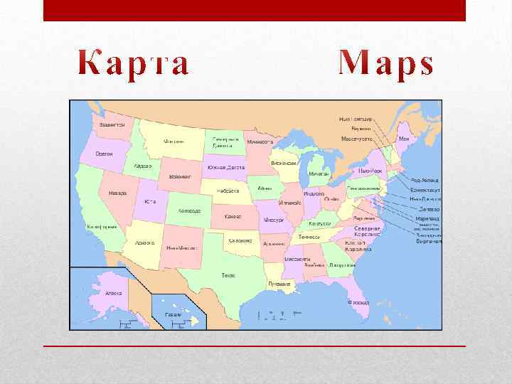 Соединённые Шта ты Аме рики (США) — United States of America (USA) - a country in государство в Северной Америке. Площадь North America. Area - 9. 5 million km ² ( 4 th — 9, 5 млн км² (4 -е место в мире). Население place in the world). Population - 320 million — 320 млн человек (2013, оценка; 3 -е место people ( 2013 estimate , the third largest in the в мире). Столица — город Вашингтон. world ). Capital - the city of Washington. Соединённые Штаты граничат на севере с United States border with Canada in the north , Канадой, на юге — с Мексикой, также in the south - Mexico, also have a maritime имеют морскую границу с Россией. border with Russia. By the Pacific Ocean to the Омываются Тихим океаном с запада, west , the Atlantic Ocean - from the east and Атлантическим океаном — с востока и the Arctic Ocean - from the north. Северным Ледовитым океаном — с севера. Administratively, the country is divided into 50 Административно страна делится на 50 states and the District of Columbia, United штатов и федеральный округ Колумбия, в States subordinate is also a number of island подчинении США также находится ряд territories. U. S. residents called the Americans островных территорий. Жителей США and to the United States itself is the common называют американцами, а к самим США name of America. In the Russian language применяется общее название Америка. В until the middle of the XX century was also the русском языке до середины XX века также name of common North American United было распространено наименование Северо. States Американские Соединённые Штаты