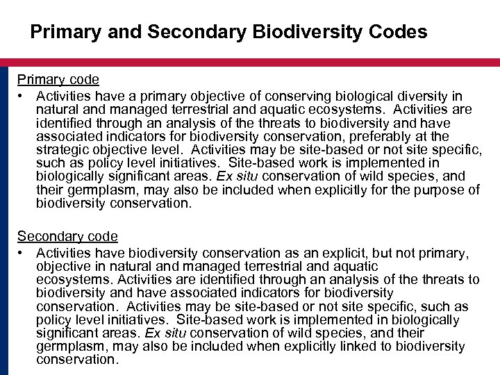 Primary and Secondary Biodiversity Codes Primary code • Activities have a primary objective of conserving biological diversity in natural and managed terrestrial and aquatic ecosystems. Activities are identified through an analysis of the threats to biodiversity and have associated indicators for biodiversity conservation, preferably at the strategic objective level. Activities may be site-based or not site specific, such as policy level initiatives. Site-based work is implemented in biologically significant areas. Ex situ conservation of wild species, and their germplasm, may also be included when explicitly for the purpose of biodiversity conservation. Secondary code • Activities have biodiversity conservation as an explicit, but not primary, objective in natural and managed terrestrial and aquatic ecosystems. Activities are identified through an analysis of the threats to biodiversity and have associated indicators for biodiversity conservation. Activities may be site-based or not site specific, such as policy level initiatives. Site-based work is implemented in biologically significant areas. Ex situ conservation of wild species, and their germplasm, may also be included when explicitly linked to biodiversity conservation.