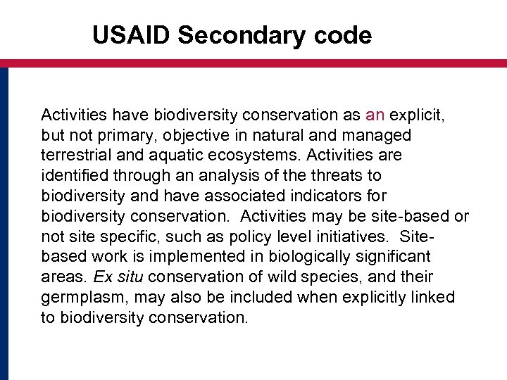 USAID Secondary code Activities have biodiversity conservation as an explicit, but not primary, objective in natural and managed terrestrial and aquatic ecosystems. Activities are identified through an analysis of the threats to biodiversity and have associated indicators for biodiversity conservation. Activities may be site-based or not site specific, such as policy level initiatives. Sitebased work is implemented in biologically significant areas. Ex situ conservation of wild species, and their germplasm, may also be included when explicitly linked to biodiversity conservation.