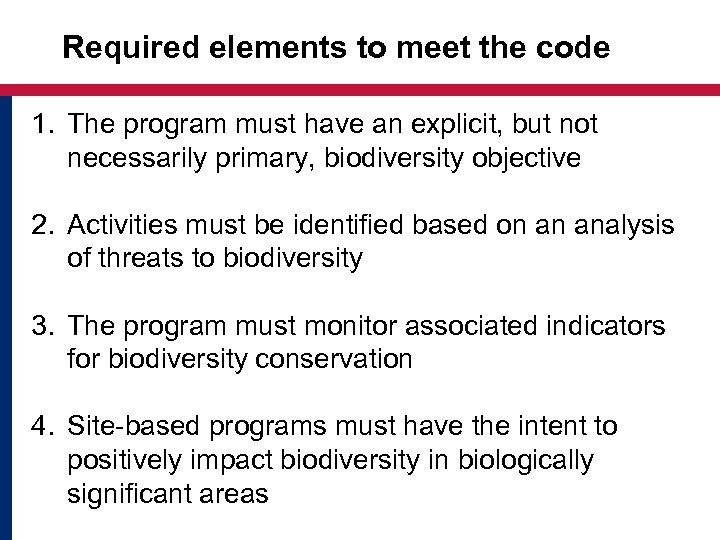 Required elements to meet the code 1. The program must have an explicit, but not necessarily primary, biodiversity objective 2. Activities must be identified based on an analysis of threats to biodiversity 3. The program must monitor associated indicators for biodiversity conservation 4. Site-based programs must have the intent to positively impact biodiversity in biologically significant areas