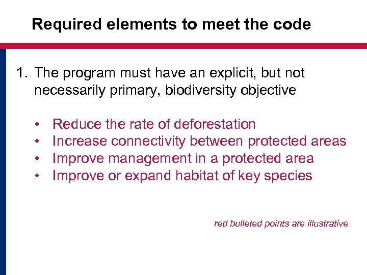 Required elements to meet the code 1. The program must have an explicit, but not necessarily primary, biodiversity objective • • Reduce the rate of deforestation Increase connectivity between protected areas Improve management in a protected area Improve or expand habitat of key species red bulleted points are illustrative