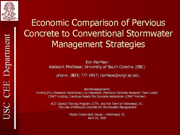 USC CEE Department Economic Comparison of Pervious Concrete to Conventional Stormwater Management Strategies Ken Harrison Assistant Professor, University of South Carolina (USC) phone: (803) 777 -1917; harriskw@engr. sc. edu Acknowledgements: Huiying Zhu (Research Assistance), Liv Haselbach (Pervious Concrete Research Team Lead) CMAT Funding, Carolinas Ready Mix Concrete Association (CMAT Partner) ACE Coastal Training Program (CTP) and the Town of Hollywood, SC: The Use of Pervious Concrete for Stormwater Management Poplar Grove Boat House – Hollywood, SC April 25, 2007