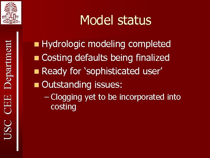 USC CEE Department Model status n Hydrologic modeling completed n Costing defaults being finalized n Ready for ‘sophisticated user’ n Outstanding issues: – Clogging yet to be incorporated into costing
