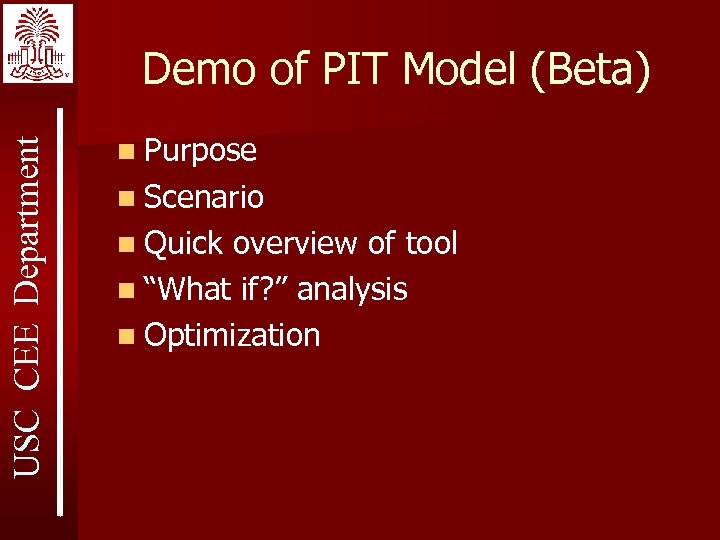USC CEE Department Demo of PIT Model (Beta) n Purpose n Scenario n Quick overview of tool n “What if? ” analysis n Optimization